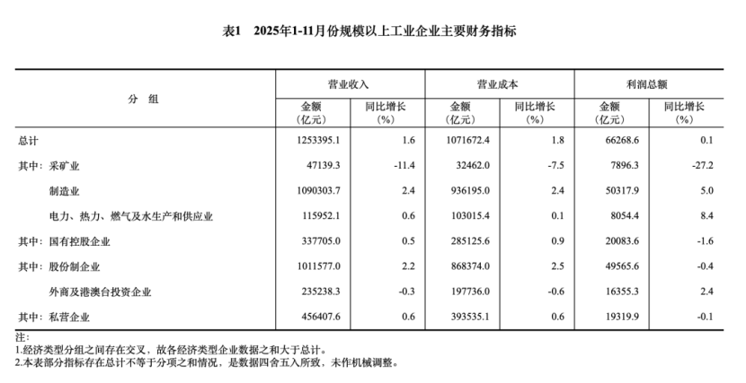 1—11月份,全国规模以上工业企业实现利润总额66268.6亿元,同比增长0.1%(按可比口径计算,详见附注二)。