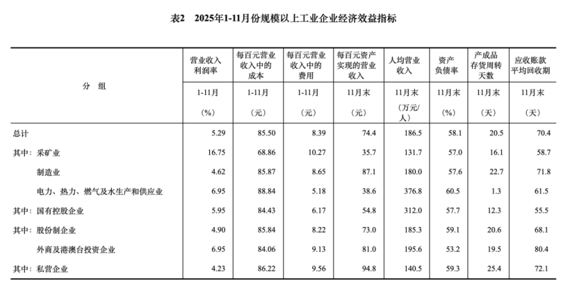11月末,规模以上工业企业资产总计189.28万亿元,同比增长4.8%;负债合计109.96万亿元,增长5.0%;所有者权益合计79.32万亿元,增长4.5%;资产负债率为58.1%,同比上升0.1个百分点。